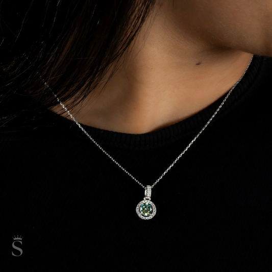 "Ocean Eye" Aqua Moissanite Halo Set Pendant Necklace With Chain 925 Silver